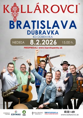 Priatelia, príďte aj Vy zažiť nádhernú novoročnú atmosféru v podaní kapely Kollárovci, kde zaznejú všetky ich známe hity. Doprajte si novoročné hudobno-zábavné uvoľnenie v podaní jedinečnej kapely KOLLÁROVCI, kde načerpáte veľa pozitívnej energie.