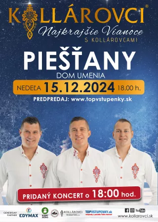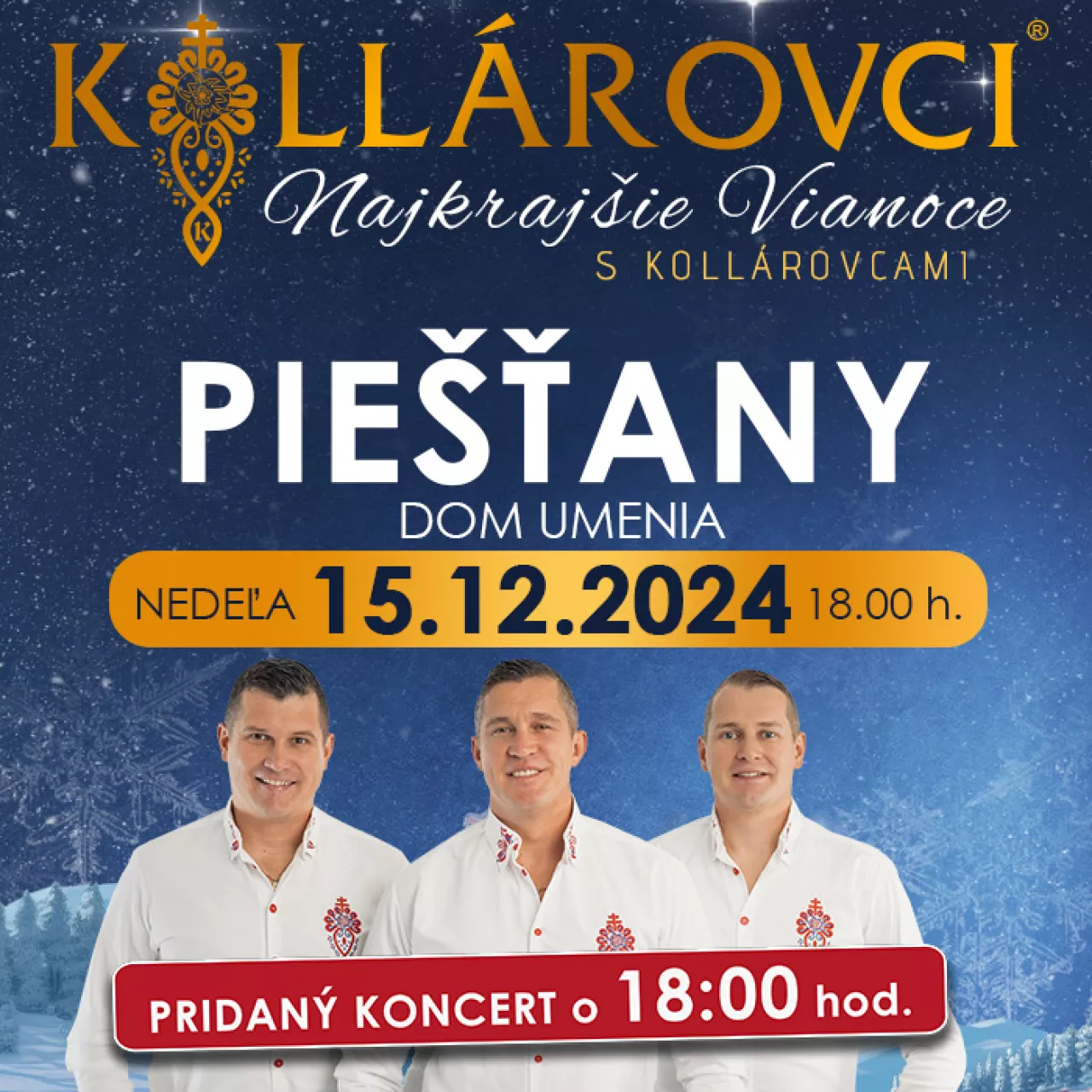 Priatelia, príďte aj Vy zažiť nádhernú vianočnú atmosféru v podaní kapely Kollárovci, kde zaznejú vianočné koledy a taktiež aj ich známe hity. Doprajte si predvianočné hudobno-zábavné uvoľnenie v podaní jedinečnej kapely KOLLÁROVCI, kde načerpáte veľa pozitívnej energie.