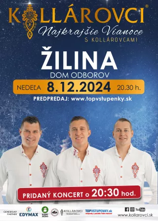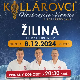 Priatelia, príďte aj Vy zažiť nádhernú vianočnú atmosféru v podaní kapely Kollárovci, kde zaznejú vianočné koledy a taktiež aj ich známe hity. Doprajte si predvianočné hudobno-zábavné uvoľnenie v podaní jedinečnej kapely KOLLÁROVCI, kde načerpáte veľa pozitívnej energie.