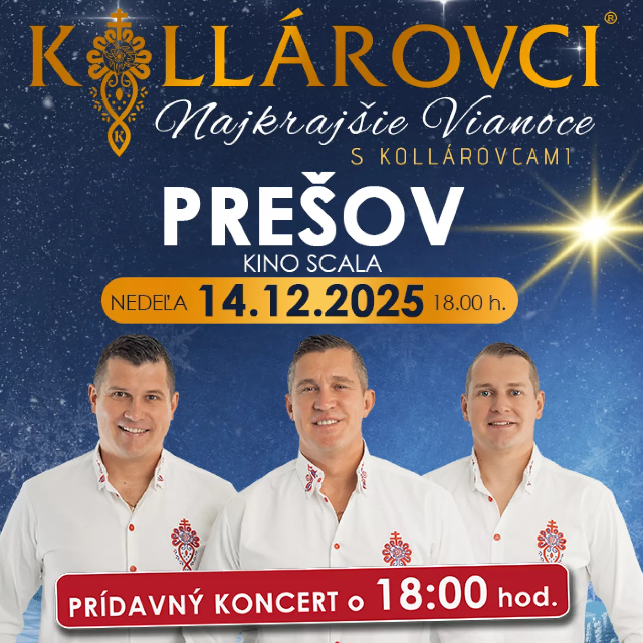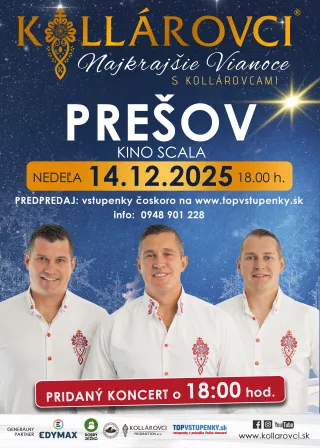 Priatelia, príďte aj Vy zažiť nádhernú vianočnú atmosféru v podaní kapely Kollárovci, kde zaznejú vianočné koledy a taktiež aj ich známe hity. Doprajte si predvianočné hudobno-zábavné uvoľnenie v podaní jedinečnej kapely KOLLÁROVCI, kde načerpáte veľa pozitívnej energie.