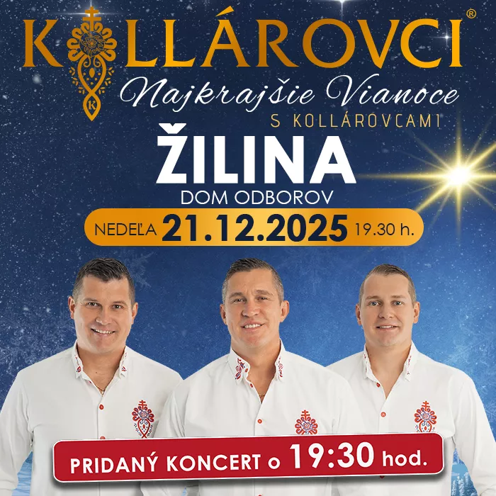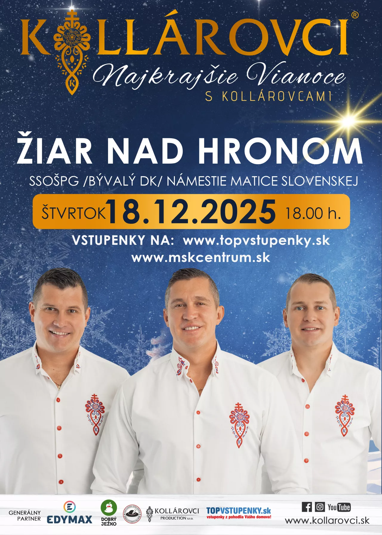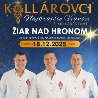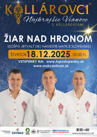 Priatelia, príďte aj Vy zažiť nádhernú vianočnú atmosféru v podaní kapely Kollárovci, kde zaznejú vianočné koledy a taktiež aj ich známe hity. Doprajte si predvianočné hudobno-zábavné uvoľnenie v podaní jedinečnej kapely KOLLÁROVCI, kde načerpáte veľa pozitívnej energie.