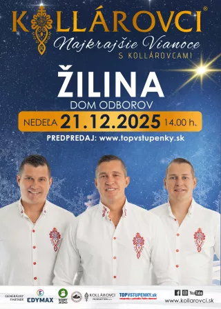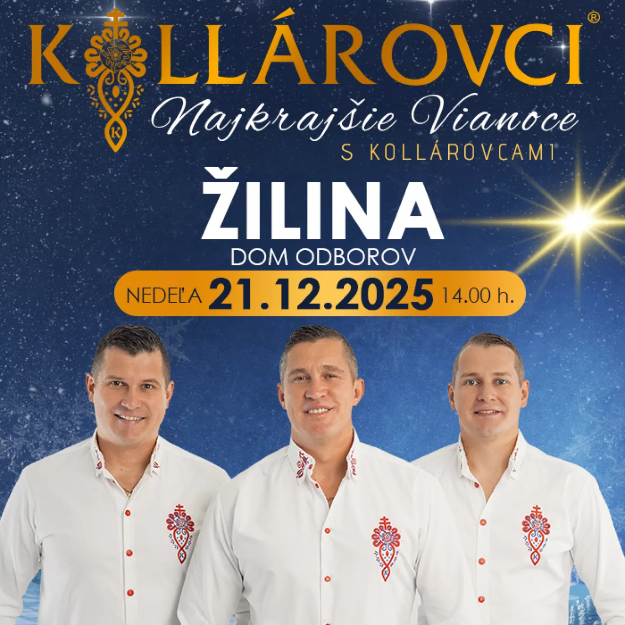 Priatelia, príďte aj Vy zažiť nádhernú vianočnú atmosféru v podaní kapely Kollárovci, kde zaznejú vianočné koledy a taktiež aj ich známe hity. Doprajte si predvianočné hudobno-zábavné uvoľnenie v podaní jedinečnej kapely KOLLÁROVCI, kde načerpáte veľa pozitívnej energie.